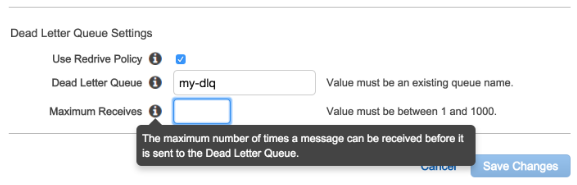 Then, configure a Redrive Policy for your source / inbound queue. As shown in the screen dump of the Amazon SQS admin console below, this entails configuring the name of the queue to use as the DLQ, and a parameter named Maximum Receives –